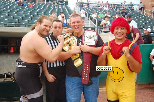Lowell Spinners on-field promotion Published December 2, 2017 at 498 × 331 The future Warbeard Hanson, bemused Crockett, double champ Milonas and Psycho